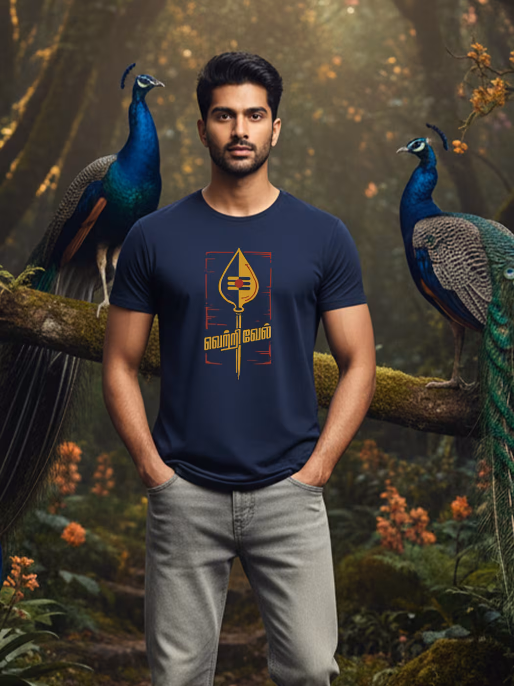 Stylish and meaningful Vetri Vel T-Shirt For Men – Half Sleeve featuring sacred Tamil symbolism, perfect for expressing devotion and cultural pride in a comfortable half sleeve design.